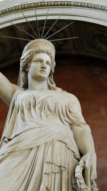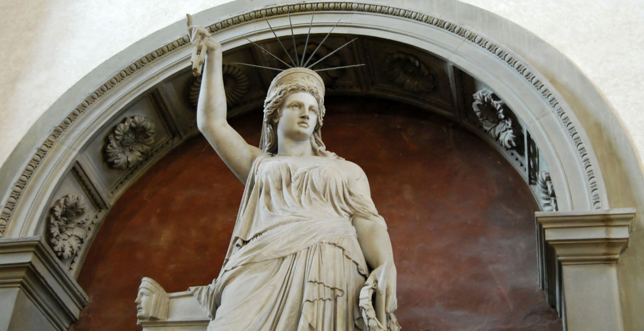 In the right hand of the statue done by Pio Fedi one can see a piece of a chain, symbolizing the allegory of freedom, and a tiara with eight rays on its head. Note how these two particulars were reinterpreted by Bartholdi for the Statue of Liberty in America. The French artist put the torch in the same hand, another allegory of freedom, and on its head a tiara with one less ray to symbolize the seven continents and seas.