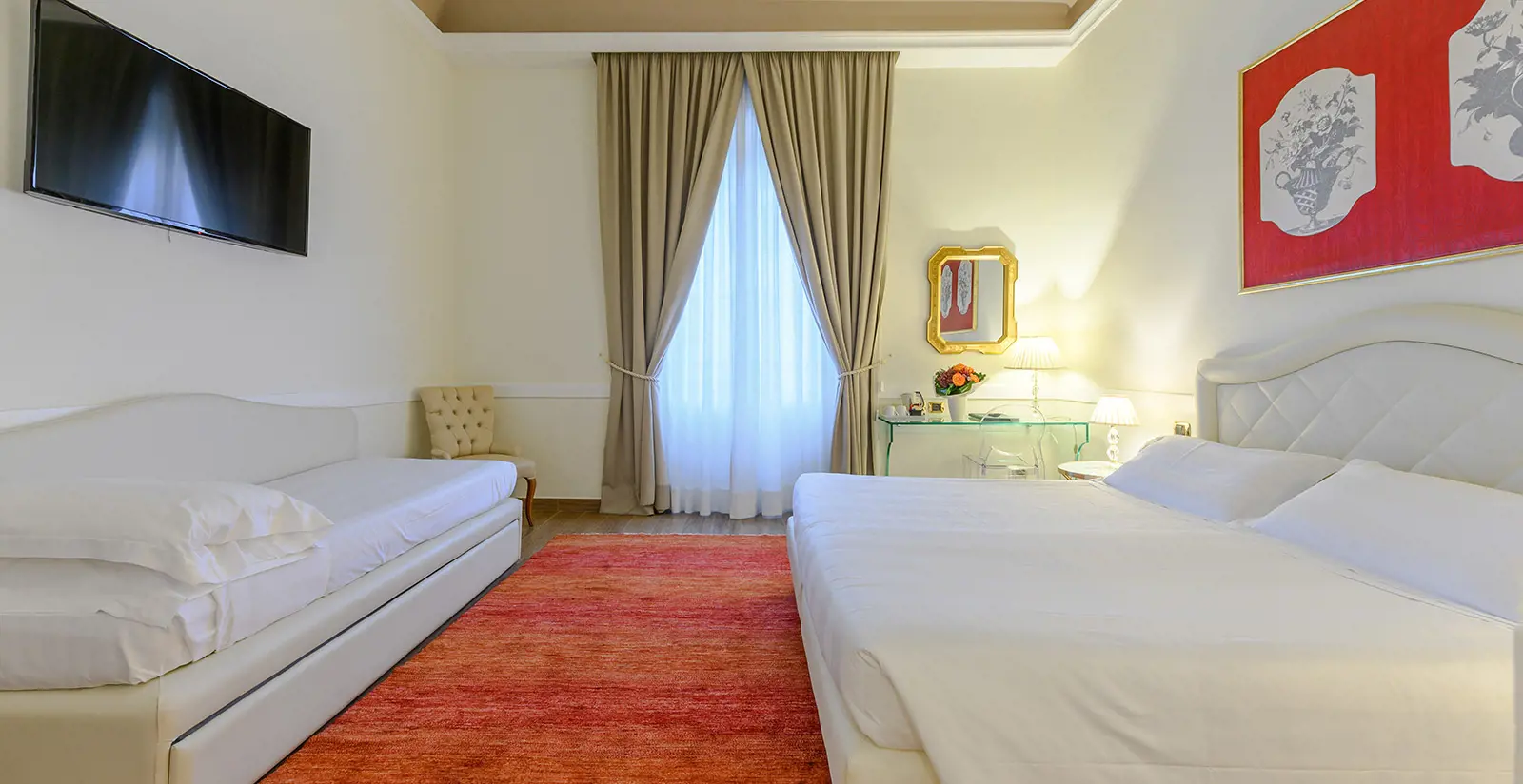 Bed types: 1 single bed, 1 double bed, or 3 single beds.
